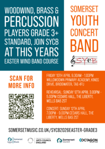 The purpose of this course is to give you the opportunity to play alongside the Somerset Youth Concert Band which you can join as a member when you are Grade 5 standard. The SYCB has about 60 members so it is a fantastic opportunity to play in a large ensemble.